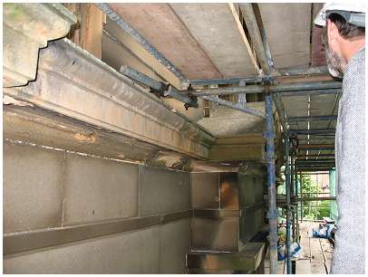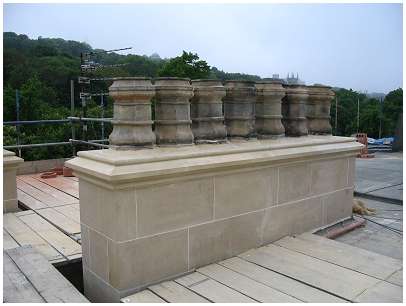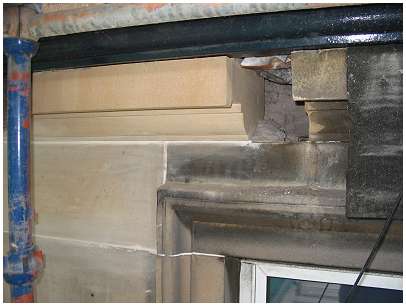 Left: Details of the dentils between the 2nd and 3rd floors on the Hillside Crescent elevation. These are all badly
